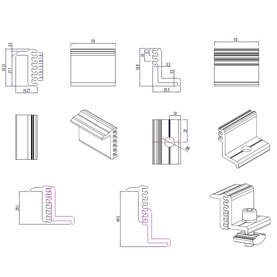 Boční svorka z hliníku 6060, nastavitelná díky posuvným drážkám, pro montáž fotovoltaických modulů 30-50 mm.