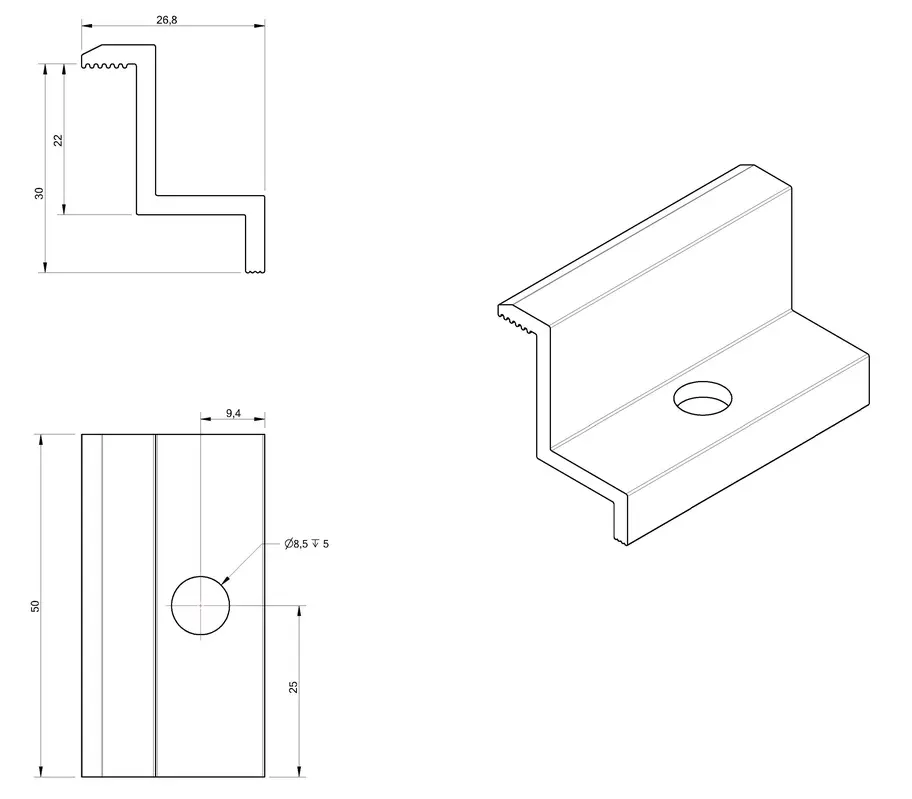 Boční přítlačná svorka z hliníku 6060 eloxovaný, 30 mm, otvor M8, pro fotovoltaické moduly.