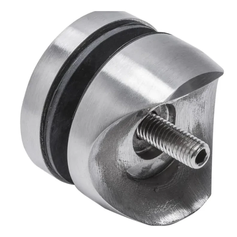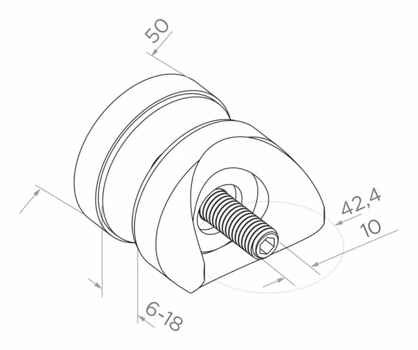 Bodový držák pro sklo o průměru 50 mm vyrobený z nerezové oceli AISI 304 v saténovém provedení. Určený pro upevnění skleněných tabulí o tloušťce od 8 do 17,52 mm na kulatou trubku o průměru 42,4 mm. Díky použití kyselinovzdorné oceli se držák osvědčuje jak uvnitř budov, tak venku — v zábradlích teras, balkonů, schodišťových halách a skleněných zastřešeních.