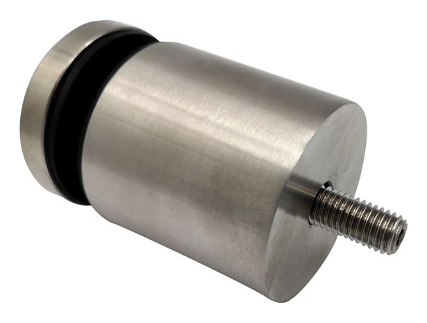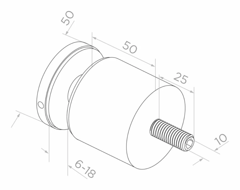 Držák je element zašroubovací, vybavený závitovým čepem M10 o délce 25 mm, který umožňuje spolehlivé spojení s nosnou konstrukcí — sloupkem nebo ocelovým profilem. Distanční korpus o délce 50 mm zajišťuje stabilní odstup skleněné tabule od montážního podkladu. Mezi dociskovou podložkou a korpusem se nacházejí gumová těsnění, která chrání sklo před mechanickým poškozením a eliminují bodová napětí. Systém je určen pro upevnění na ploché plochy.