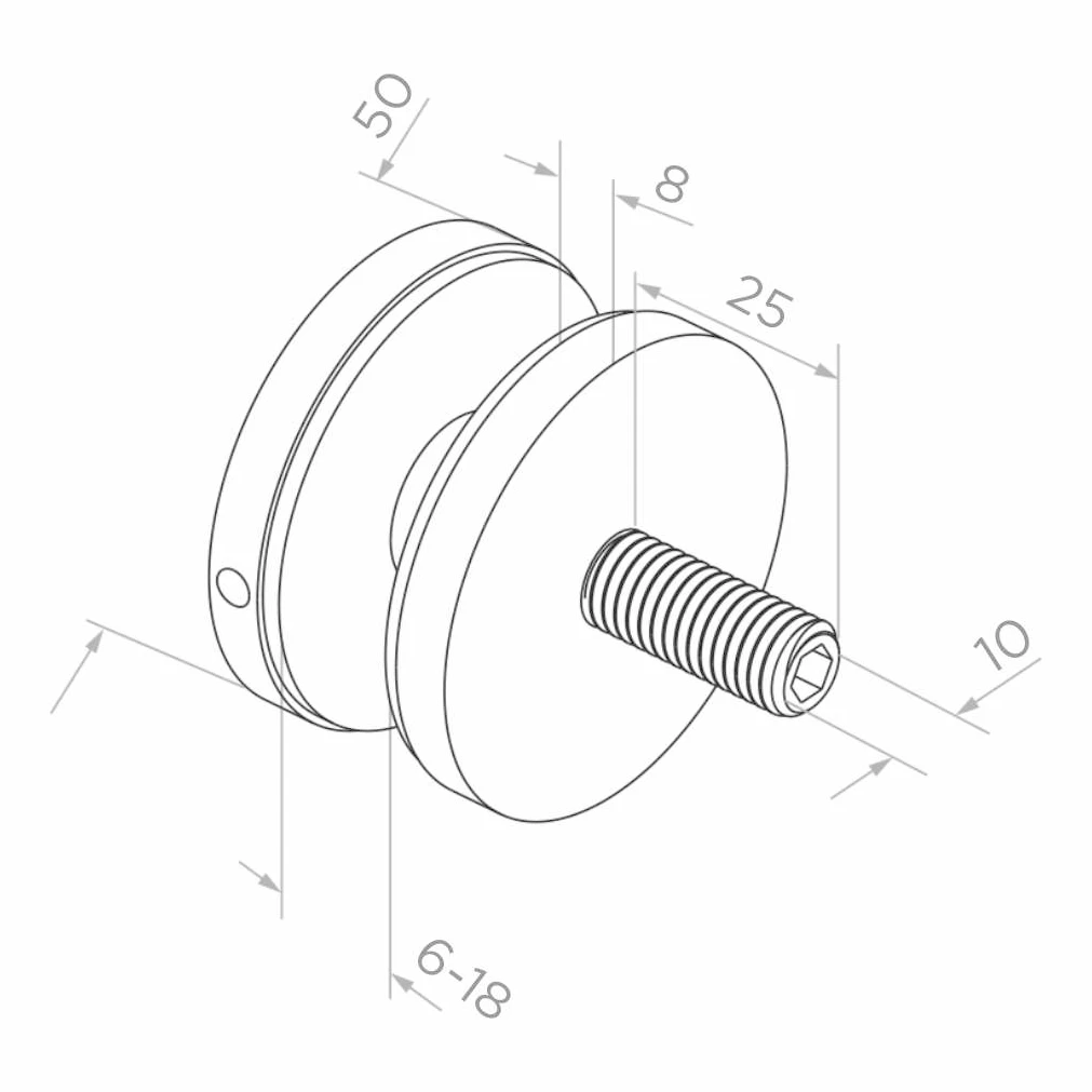 Bodový držák skla o průměru 50 mm je robustní upevňovací prvek vyrobený z nerezové oceli AISI 304 v saténovém provedení. Je určen pro montáž skleněných tabulí o tloušťce od 8 do 17,52 mm a uplatní se jak v zábradlích a přístřešcích, tak i v fasádních konstrukcích. Díky imbusovému otvoru v závitovém trnu je montáž rychlá a pohodlná — stačí imbusový klíč.