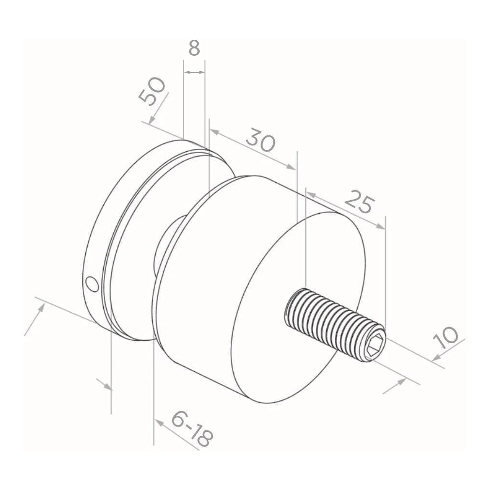 Bodový držák skla fi 50 mm z nerezové oceli je robustní upevňovací prvek určený k montáži skleněných tabulí na rovné povrchy. Vyroben z oceli AISI 304 v saténovém provedení zajišťuje estetický, moderní vzhled a vysokou odolnost proti korozi. Díky závitovému čepu M10 se držák šroubuje přímo do připraveného otvoru v podkladu, což výrazně zjednodušuje a urychluje montáž skleněných zábradlí, příčkových stěn, schodišťových obkladů a dalších skleněných konstrukcí.
