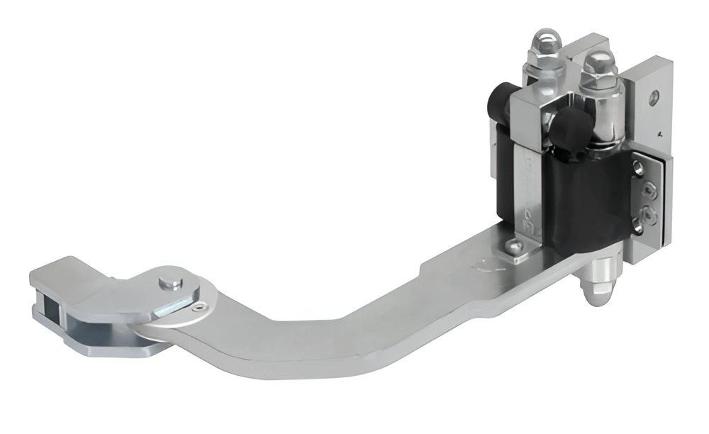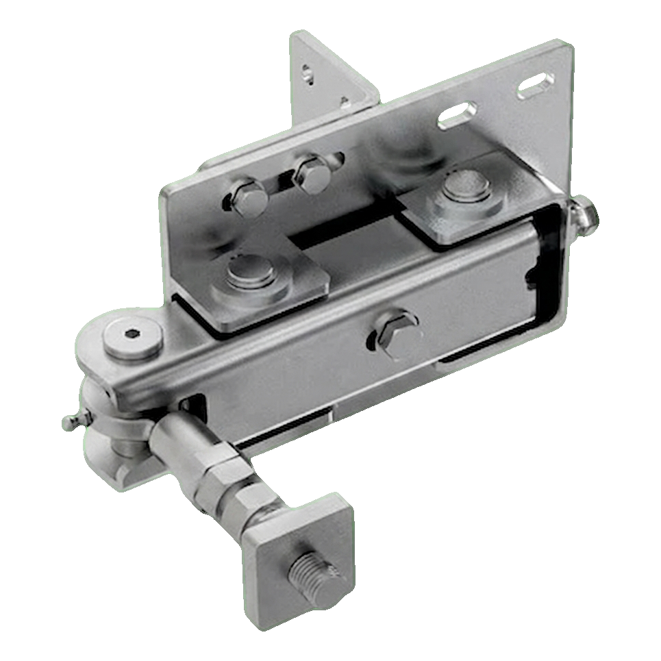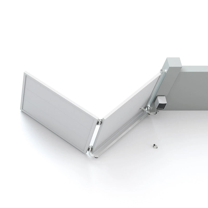 - Dolní pant s převodovkou a ramenem — montovaný v dolní části křídla brány, odpovědný za pohon skládání; oboustranně skládací transmisní rameno se spojuje se spodem prvního křídla