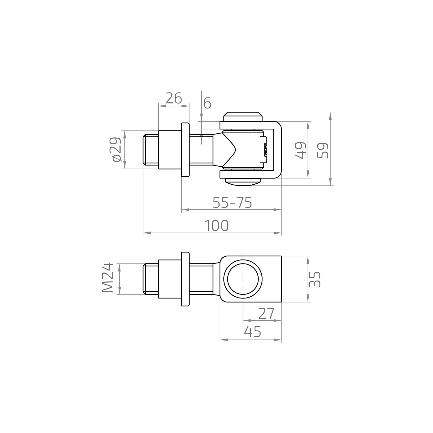 Závěs je určen k svařování přímo do ocelové konstrukce słoupku brány a křídla brány. Element ve tvaru písmene U se přivaří ke sloupku nebo křídlu a závitový čep M24 s nastavovací maticí umožňuje plynulou korekci polohy brány ve svislém směru. Rozsah nastavení činí 55–75 mm, což poskytuje 20 mm vůle pro precizní nastavení křídla bez nutnosti opětovného svařování.