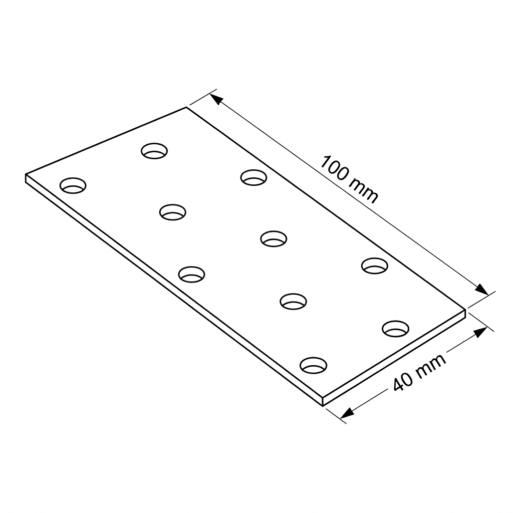 Univerzální perforace s rovnoměrně rozmístěnými otvory umožňuje použití destičky v mnoha variantách spojů — symetrických i posunutých. Kompaktní formát 40×100 mm při tloušťce 2,0 mm zajišťuje dostatečnou pevnost pro typické tesařské aplikace a zároveň snadné skladování a přepravu i ve větších množstvích.