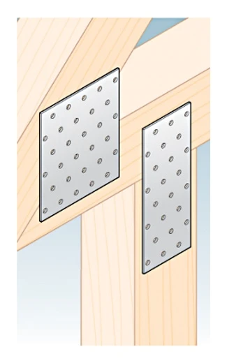 Děrované destičky se nejčastěji používají při montáži střešních vazníků, kde zajišťují trvalé a stabilní spojení prvků krokví se sloupky a vzpěrami. Uplatní se také všude tam, kde je zapotřebí rychlá a opakovatelná montáž plochých spojovacích prvků — od střešních konstrukcí po pergoly, přístřešky a hospodářské stavby. Kotvení se provádí kroužkovými hřebíky o průměru ø4 mm, které zaručují spolehlivé osazení v dřevě a plné využití deklarované únosnosti spojovacího prvku.