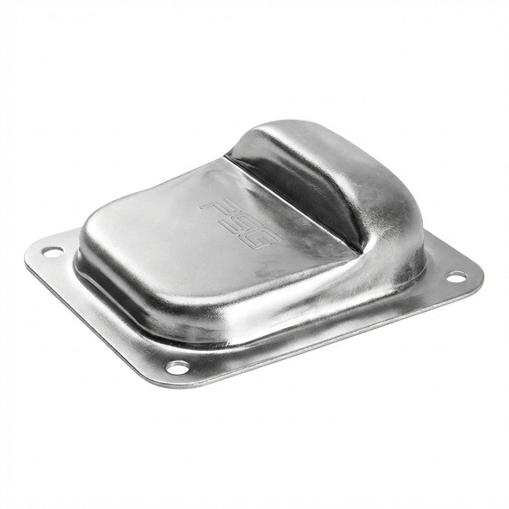 Ocelová zarážka (doraz) pro dvoukřídlá vrata určená k montáži v místě setkání křídel vrat. Robustní lisovaná konstrukce se čtyřmi montážními otvory zajišťuje rychlé a spolehlivé přišroubování k podkladu — bez svařování a bez dalšího příslušenství.