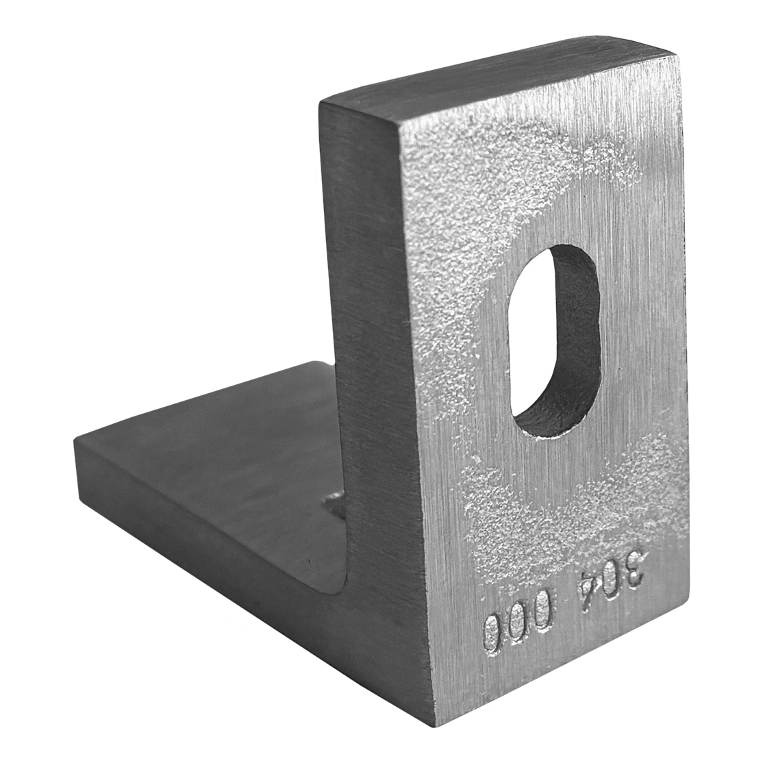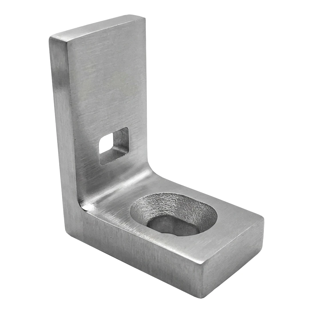 Konzola je vybavena montážním otvorem o průměru 10 mm (oválný fazolový otvor) umožňujícím precizní připevnění k nosné konstrukci a závitem pro přítlačný šroub M6/M8 (šroub není součástí sady), který stabilně zajistí sklo. Gumová vložka chrání sklo před přímým kontaktem s kovem, předchází poškrábání a zajišťuje rovnoměrný přítlak. Oválný tvar montážního otvoru umožňuje drobné seřízení polohy konzoly během montáže, což usnadňuje precizní vyrovnání celého zábradlí.