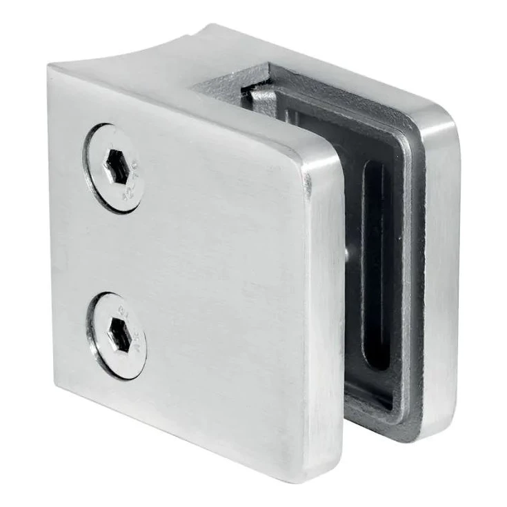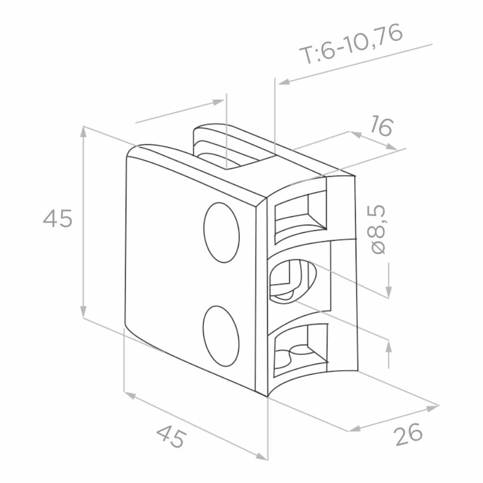 Obdélníkový držák skla určený k upevnění skleněných panelů o tloušťce od 6 do 10,76 mm na trubkové sloupky o průměru 42,4 mm. Vyroben z nerezové oceli AISI 304 s povrchovou úpravou v saténu — estetický a odolný prvek zábradlí a skleněných příček.