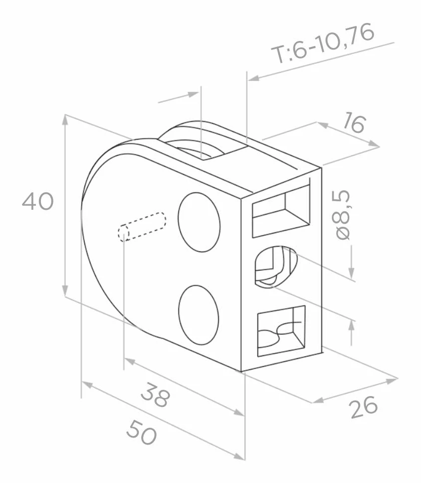 Držák skla určený k montáži na rovné povrchy, navržený pro skleněné tabule o tloušťce od 6 do 10,76 mm. Vyroben ze zámaku — slitiny zinku vyznačující se vysokou odolností proti opotřebení a vynikající slévatelností, což zaručuje precizní provedení detailů. Povrch je surový, připravený k dalšímu zpracování — ideálně se hodí pro práškové lakování, díky čemuž jej lze barevně přizpůsobit jakémukoli projektu.
