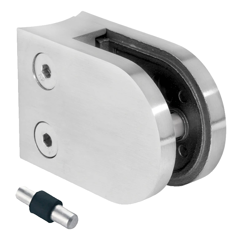 Držák je dodáván spolu se zajišťovacím pinem, který zabraňuje náhodnému vysunutí skleněné tabule. Montáž probíhá zašroubováním držáku přímo na nosnou trubku — nevyžaduje svařování ani dodatečné adaptéry. Vnitřní gumové vložky chrání hrany skla před poškrábáním a kompenzují tolerance tloušťky tabule v rozsahu 6–10,76 mm.