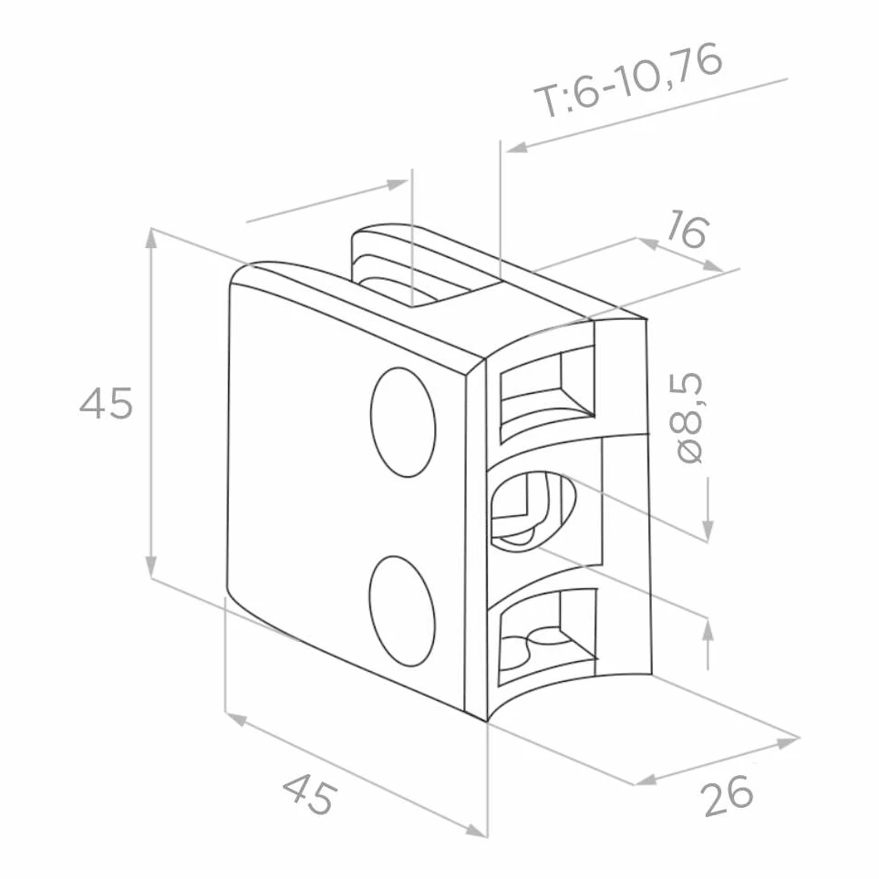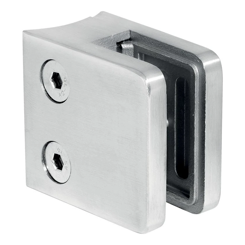 Obdélníkový držák skla 45×45×26 mm z nerezové oceli AISI 316 v saténovém provedení. Určený k montáži na trubku o průměru Ø42,4 mm, skvěle se uplatní v systémech skleněných zábradlí jak uvnitř, tak vně budov. Šroubovací konstrukce zajišťuje pevné a trvanlivé uchycení na sloupku.