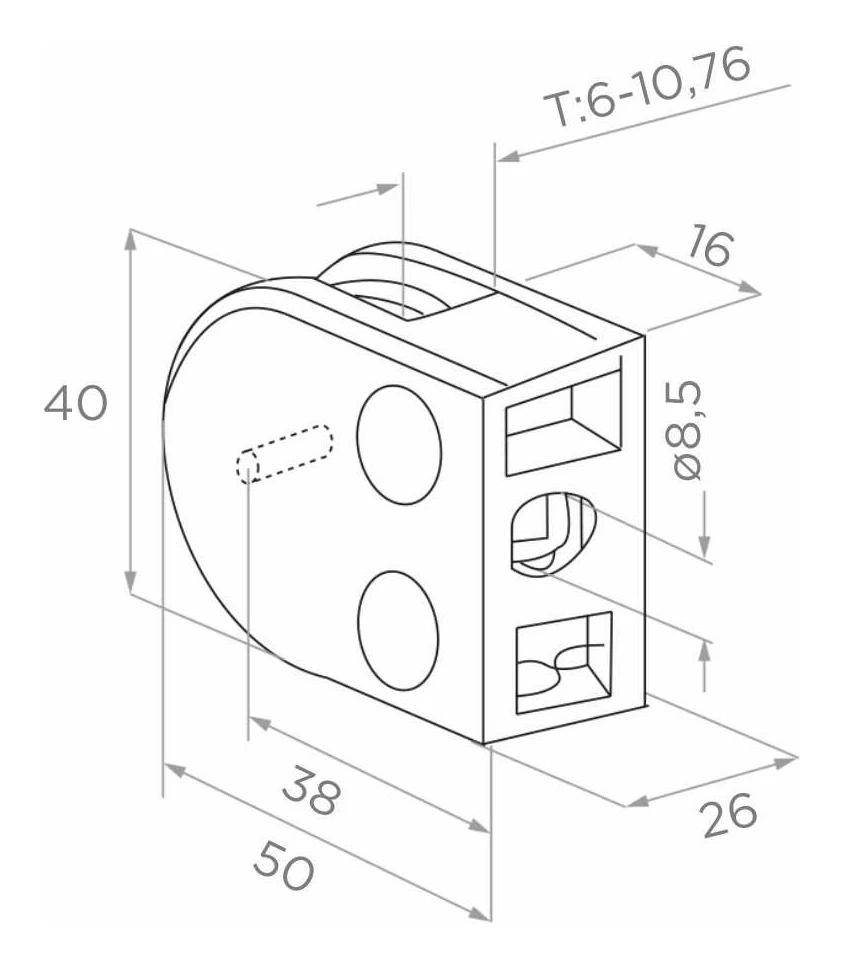 Držák se montuje přišroubováním k rovnému povrchu prostřednictvím montážního otvoru o průměru Ø 8,5 mm. Dva imbusové šrouby na přední straně držáku umožňují nastavení přítlaku skla — lze je utahovat nebo povolovat bez sejmutí držáku z konstrukce. Toto řešení výrazně urychluje montážní práce a usnadňuje servis zábradlí.