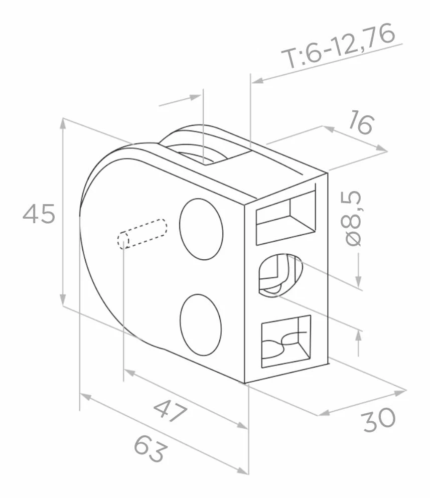 Zaoblený držák skla určený pro systémová skleněná a celoskleněná zábradlí. Slouží ke stabilnímu uchycení skleněných tabulí o tloušťce od 6 do 12,76 mm a zabraňuje jejich vysunutí díky přiloženému zajišťovacímu pinu. Vyroben z nerezové oceli AISI 304 v saténovém provedení — je odolný proti korozi a skvěle se hodí jak do interiérů, tak i pro exteriérové použití.