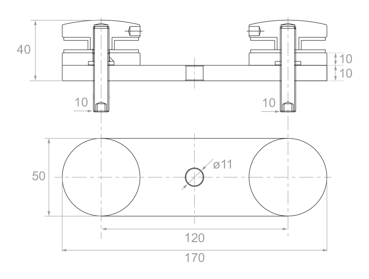 Dvojitý bodový držák skla o průměru fi 50 mm a délce 170 mm, určený pro montáž skleněných tabulí o tloušťce od 8 do 21,52 mm do nerezových zábradlí. Zajišťuje tuhost konstrukce a účinnou stabilizaci skleněných výplní při zachování moderní, minimalistické estetiky.