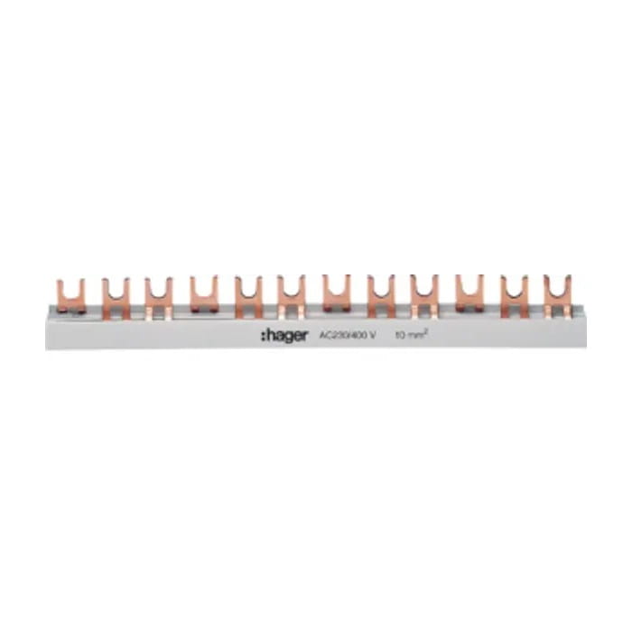 Křižovatková kolejnice 3-pólový 57mod 10mm2, KDN363B vidlicový konektor Hager Spínací lišty se používají k přemostění napájení nebo k vzájemnému propojení výrobků. Výběr správného typu sběrnice závisí na typu zařízení, a to kvůli rozdílům ve fyzikálních parametrech.