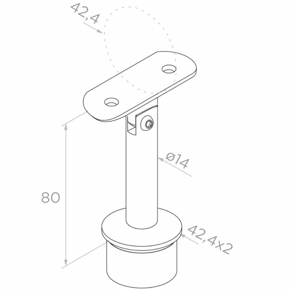 Podpěra se montuje metodou lepení — dolní pouzdro se osazuje dovnitř trubky sloupku Ø 42,4 × 2 mm pomocí lepidla na nerezovou ocel. Sedlo nahoře je přizpůsobeno zábradlí o průměru 42,4 mm a umožňuje nastavení libovolného úhlu sklonu díky kloubu s blokací imbusovým šroubem. Toto řešení se osvědčuje zejména u schodišťových zábradlí, kde úhel běhu schodů vyžaduje individuální přizpůsobení zábradlí ke sloupkům.