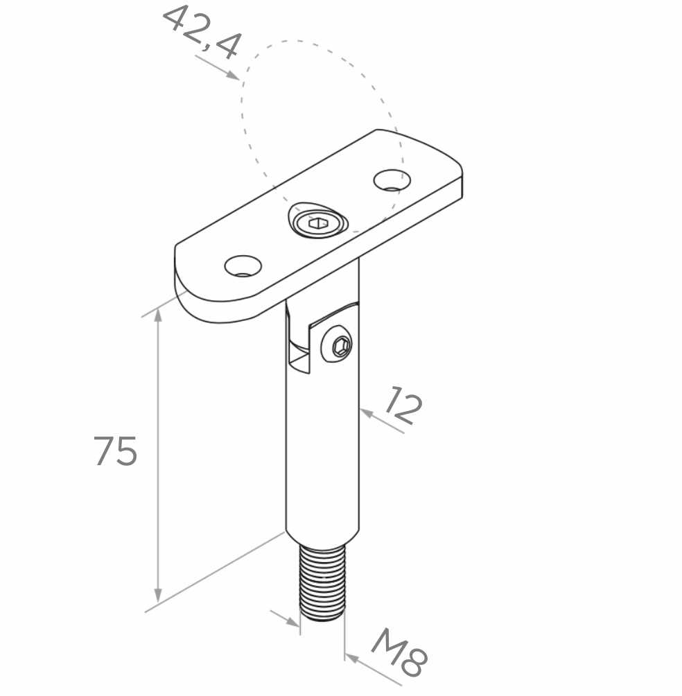 Spodní část tyče je zakončena vnějším závitem M8, což umožňuje rychlé zašroubování prvku do sloupku zábradlí. Horní montážní plech s profilem přizpůsobeným trubce fi 42,4 mm zajišťuje stabilní a estetickou oporu madla. Kloubová konstrukce výrazně zkracuje dobu montáže a eliminuje nutnost individuálního ohýbání prvků na stavbě.