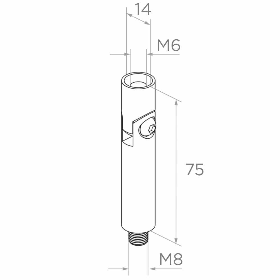 Tyč má vnější závit M8 (dolní část — pro zašroubování do sloupku) a vnitřní závit M6 (horní část — pro uchycení držáku madla), což zajišťuje univerzální použití a kompatibilitu se širokou škálou zábradlových systémů.