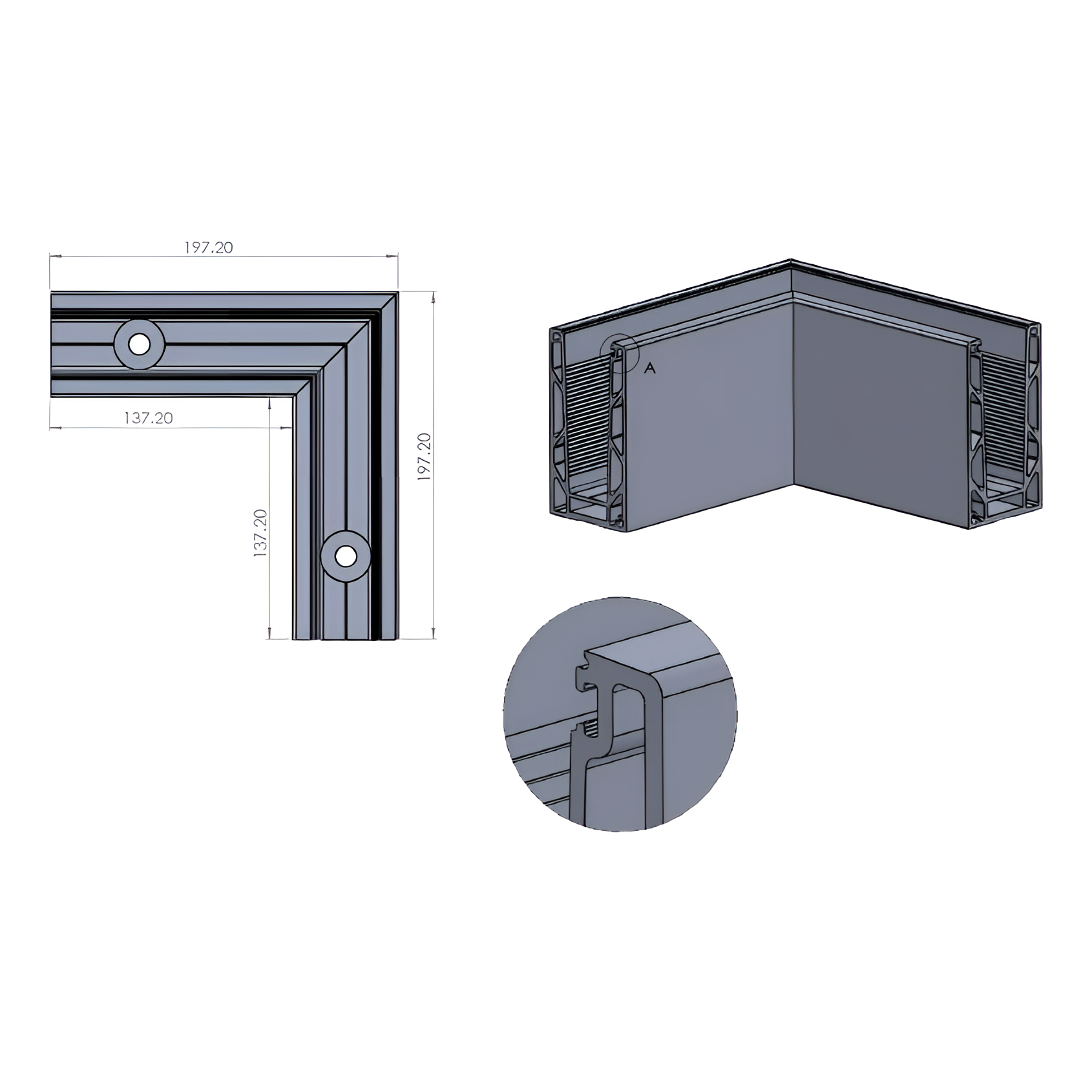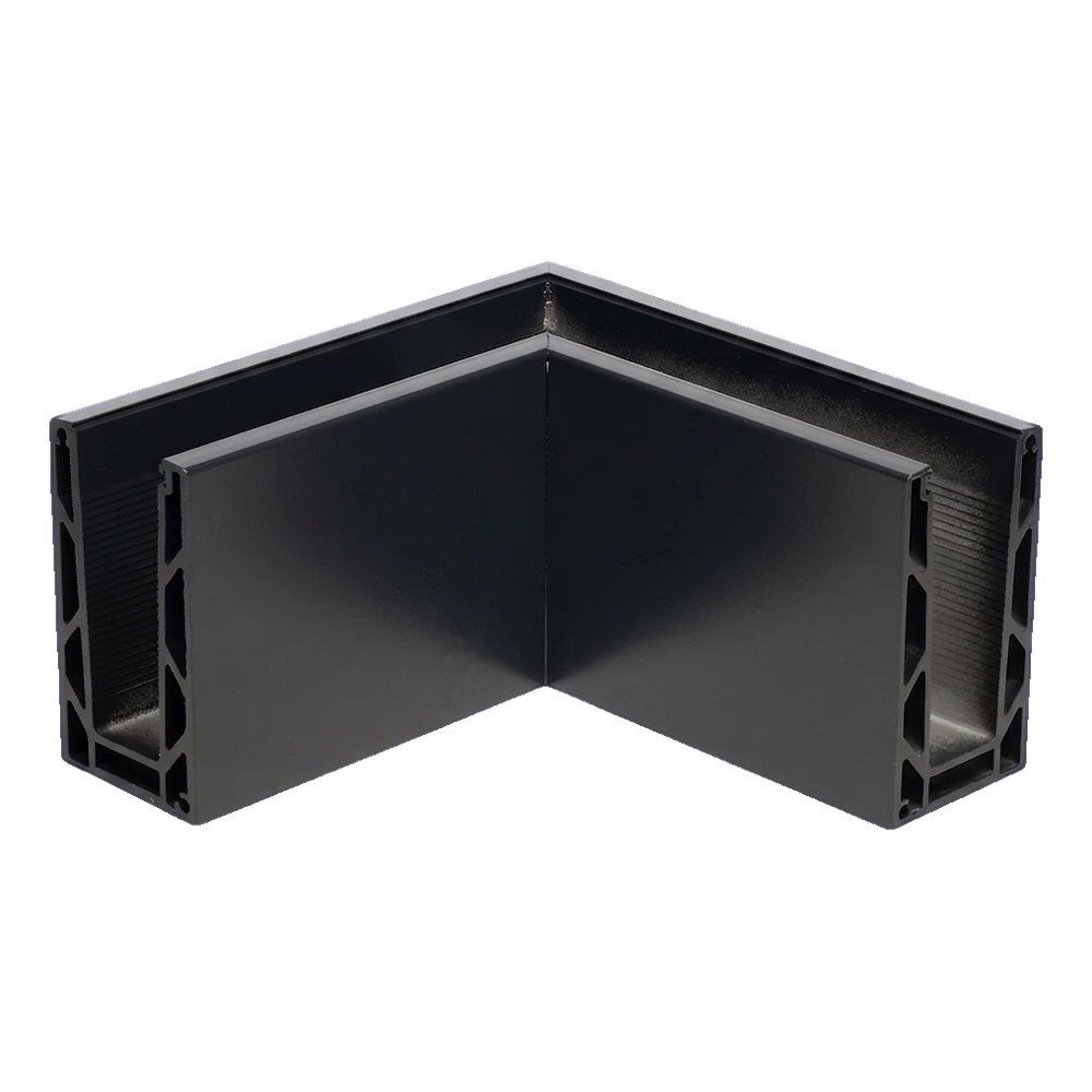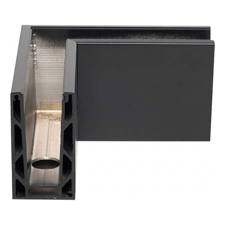Rohový profil U 90° Kozza KE 100 je prvek systému celoskleněných zábradlí určený pro tvorbu vnitřních rohů. Montuje se shora v plochém systému, vede skleněné tabule ve dvou kolmých směrech a zajišťuje kontinuitu kanálu a tuhost celého okraje zábradlí. Díky širokému rozsahu podporovaného skla (12–21,52 mm) umožňuje flexibilně přizpůsobit tloušťku tabule požadavkům projektu — od standardních prosklení po zesílené akustické pakety.