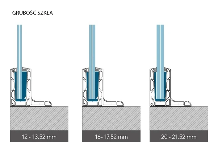 - Univerzální rozsah tlouštěk skla — profil přijímá tabule o tloušťce od 12 do 21,52 mm, což eliminuje nutnost skladování různých variant profilu