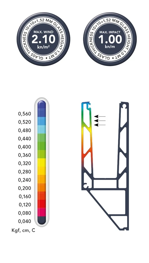 Profil KE 120 byl testován z hlediska větrného a nárazového zatížení. Pro sklo o tloušťce 10+10+1,52 mm a výšce 1,0 m činí maximální větrné zatížení 2,10 kN/m² a maximální nárazová síla — 1,00 kN/m. Výsledky posunutí jsou uváděny pro profil o délce základny 1 m při vodorovném zatížení pod 500 kg (5000 N), od základny k nejvyššímu bodu profilu.
