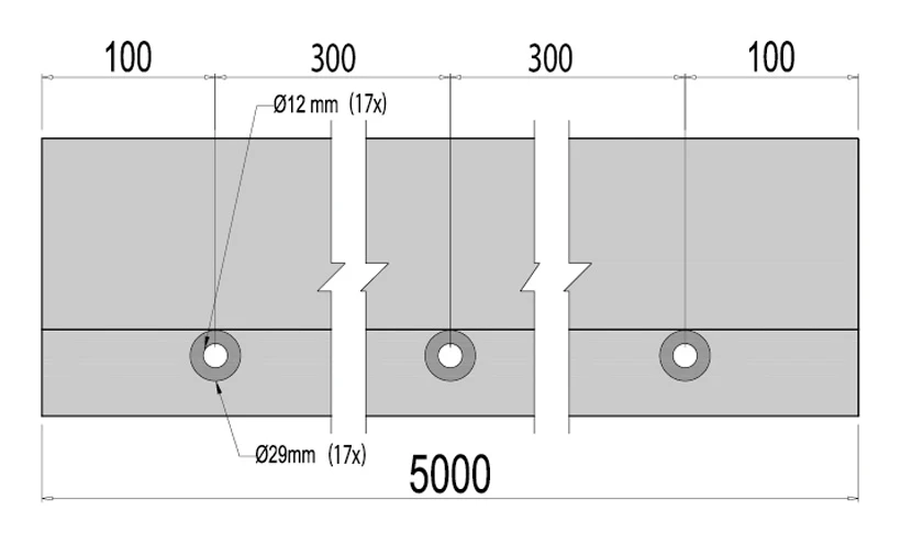 Profil má továrně vyrobených 17 montážních otvorů rozmístěných rovnoměrně po celé délce 5000 mm. Rozteč otvorů činí 300 mm a vzdálenost od kraje profilu k ose prvního a posledního otvoru — 100 mm. Každý otvor má průměr Ø12 mm se zapuštěním Ø29 mm, což umožňuje montáž šrouby se zápustnou hlavou. Přesné rozmístění otvorů výrazně urychluje instalaci — není nutné vrtat na místě.