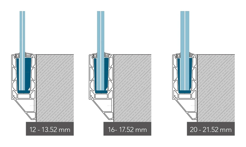 Profil KE 120 je kompatibilní se třemi rozsahy tlouštěk skla. Výběr odpovídající distanční vložky umožňuje rychlou adaptaci na konkrétní projekt — bez nutnosti objednávání jiného profilu.