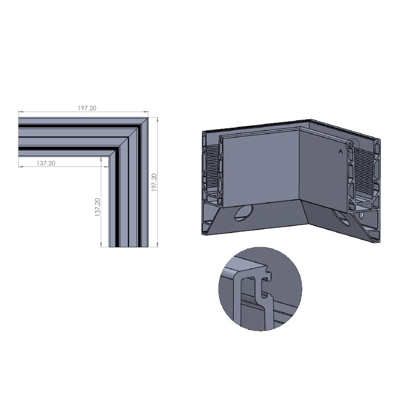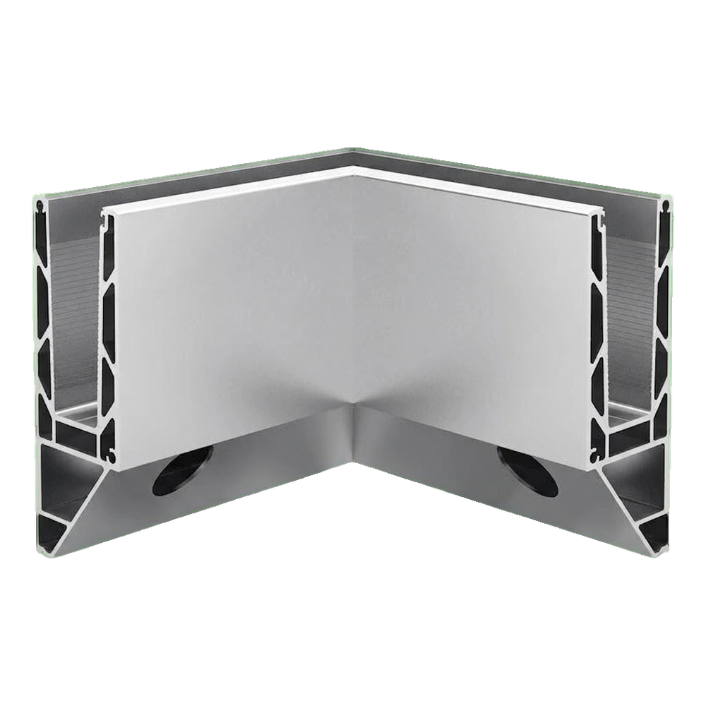 Rohový prvek je určen pro systémy celoskleného zábradlí, ve kterých jsou skleněné tabule usazeny přímo v U profilu bez nutnosti použití dodatečných bodových úchytů. Plochý systém znamená, že profil přiléhá celou plochou k hraně skla a zajišťuje rovnoměrné rozložení zatížení a stabilní držení panelu. Boční kotvení se osvědčuje zejména tam, kde není možnost kotevního uchycení v podloží – např. na hotových balkonových deskách nebo dokončených podlahách.