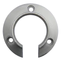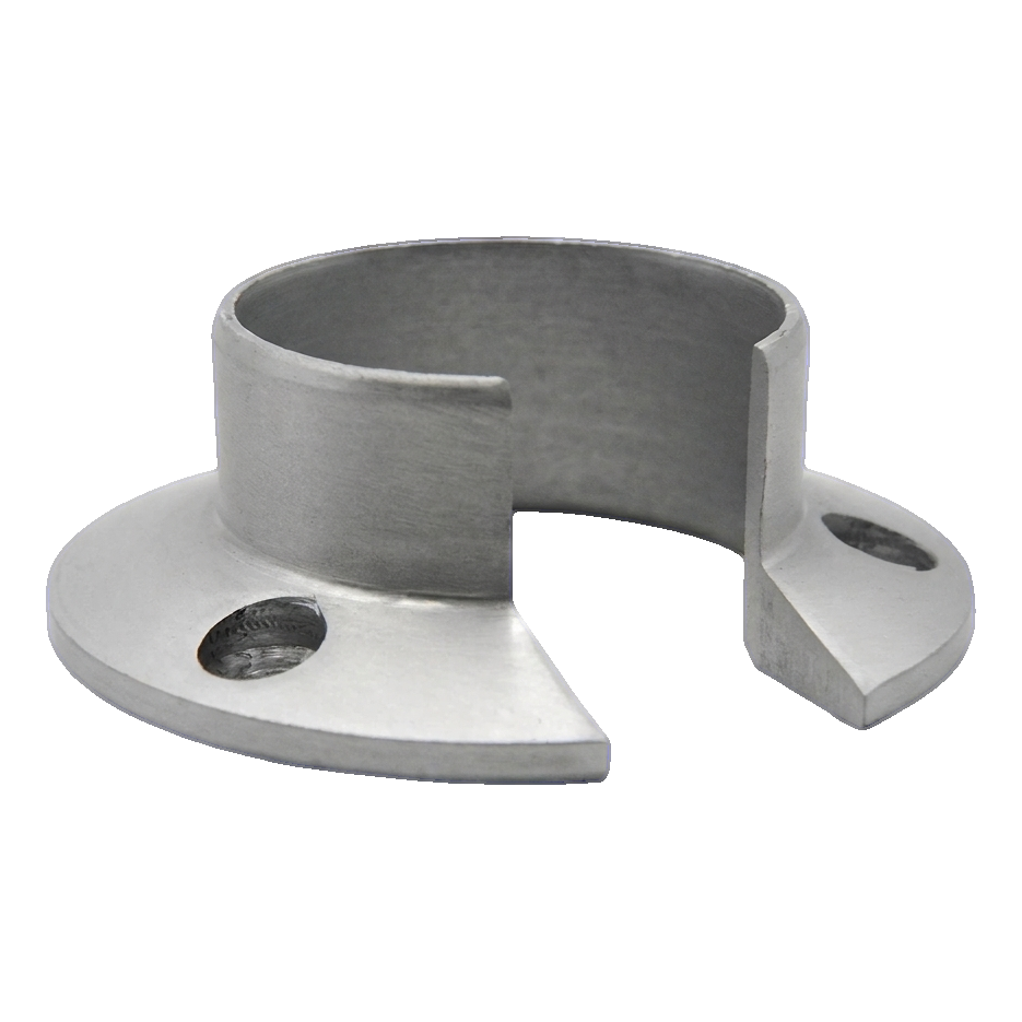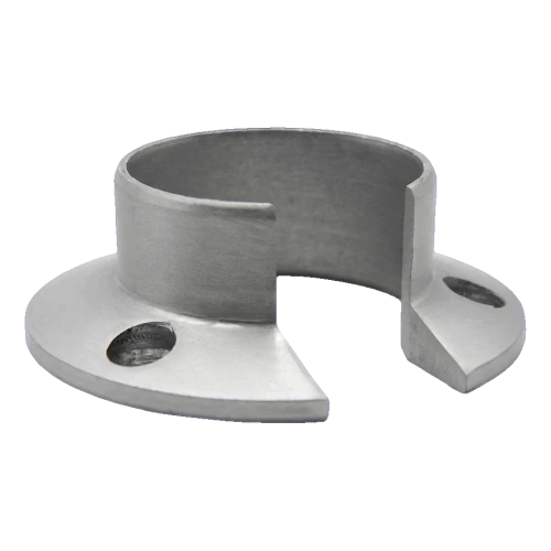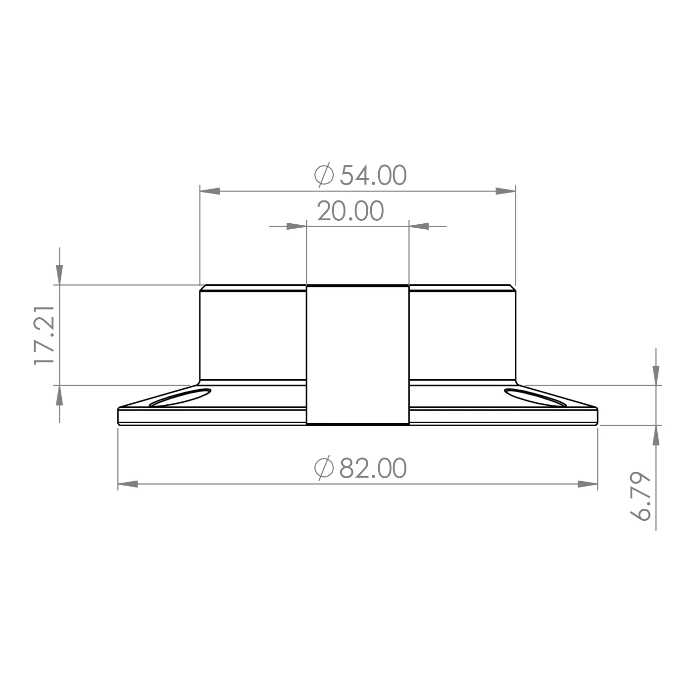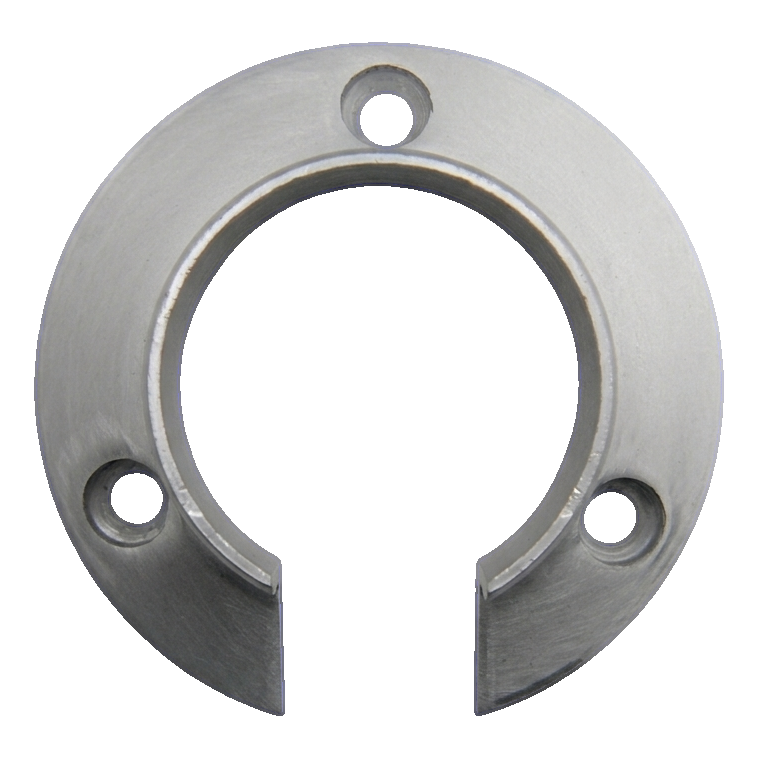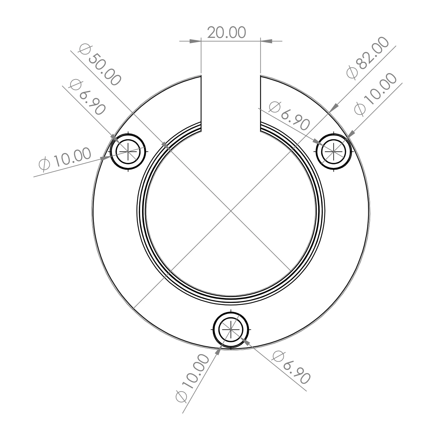 Prvek má charakteristický výřez ve tvaru písmene U o šířce 20 mm, umožňující boční nasazení na madlo bez nutnosti demontáže celého systému. Montážní příruba o průměru 82 mm zajišťuje velkou plochu přiléhání k podkladu. Tři otvory rozmístěné symetricky na obvodu příruby zaručují rovnoměrné rozložení upínacích sil. Zapuštění pro hlavy šroubů (ø 10 mm) umožňují schování hlavy šroubu v rovině příruby, což zajišťuje hladký a estetický montážní povrch.
