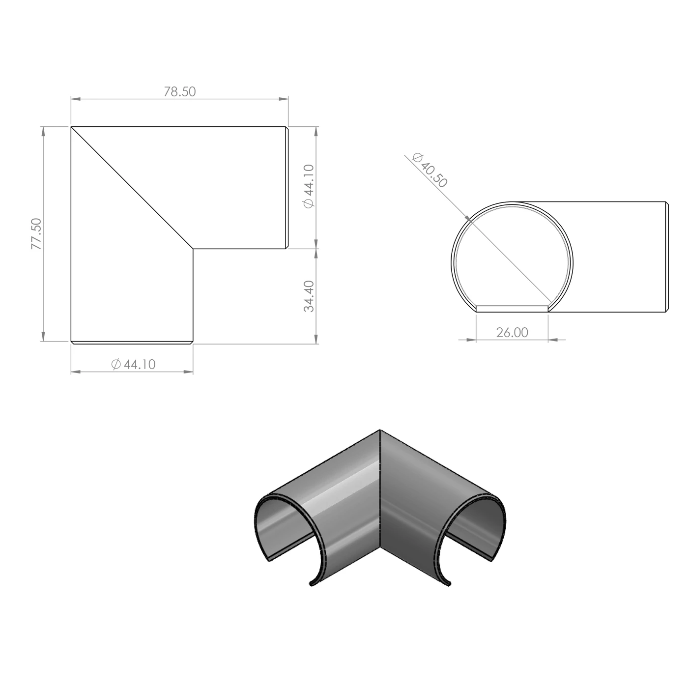 Vnější průměr spojky činí 44,10 mm, což garantuje pevné usazení na madlech fi 40 mm (vnitřní průměr 40,50 mm) a estetický, plynulý přechod bez viditelných skoků či nerovných hran. Délka ramen – odpovídajících 78,50 mm a 77,50 mm – zajišťuje solidní podporu spojení a odolnost vůči zatížení vyplývajícím z každodenního používání zábradlí. Montážní štěrbina o šířce 26 mm umožňuje snadné nasunutí prvku na hranu skleněného panelu a rychlou montáž.