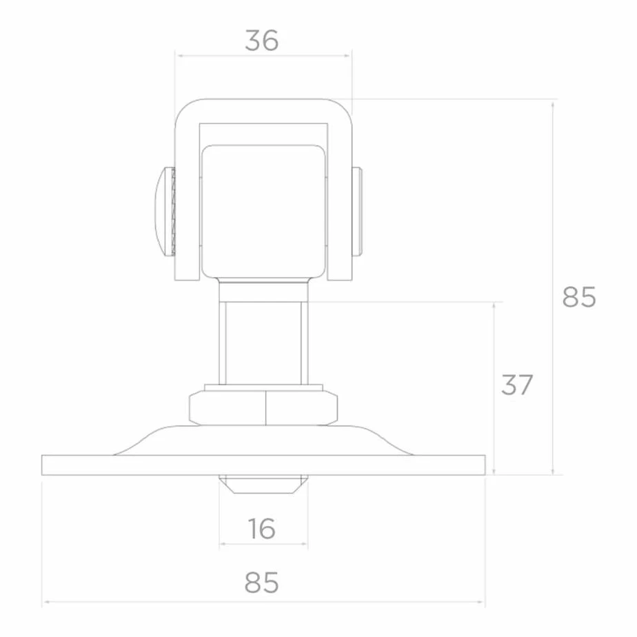 Obdélníkový štítek o rozměrech 85 × 55 mm je vybaven čtyřmi oválnými otvory, což zajišťuje pevné přišroubování ke sloupku a usnadňuje korekci polohy během instalace. Konstrukce z pozinkované oceli garantuje vysokou odolnost proti korozi — pant je plně přizpůsoben pro dlouholetý provoz venku. Oko pantu má povrchovou úpravu v černé barvě.