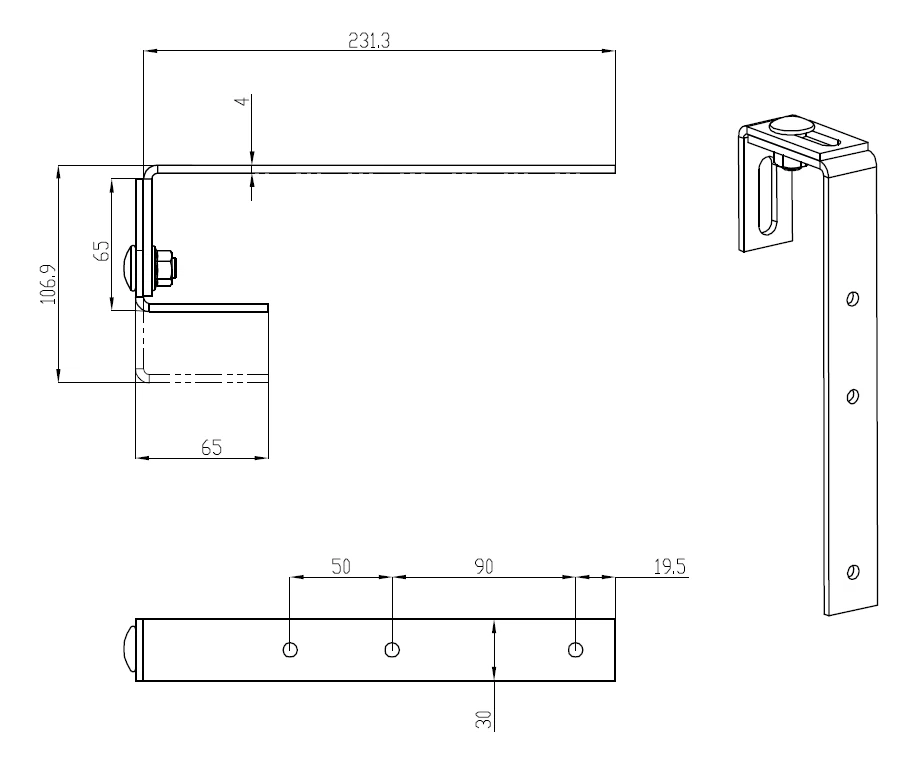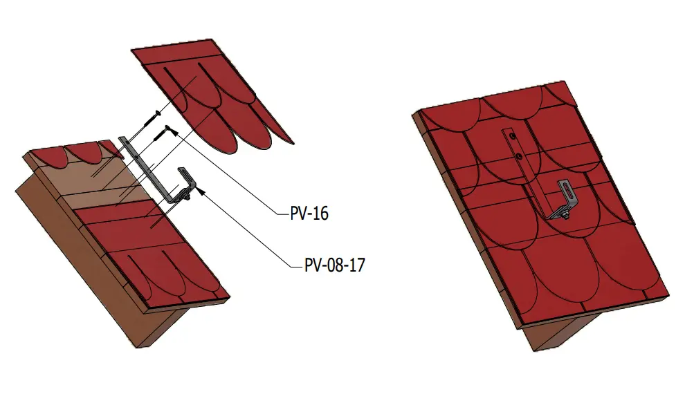 Střešní držák pro upevnění montážních lišt fotovoltaických panelů na tašky pokryté břidlicí, asfaltovým šindelem a na střechy s nerovným povrchem.