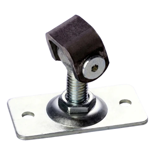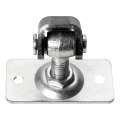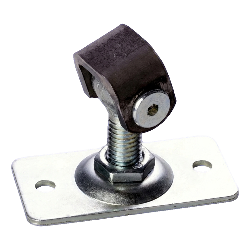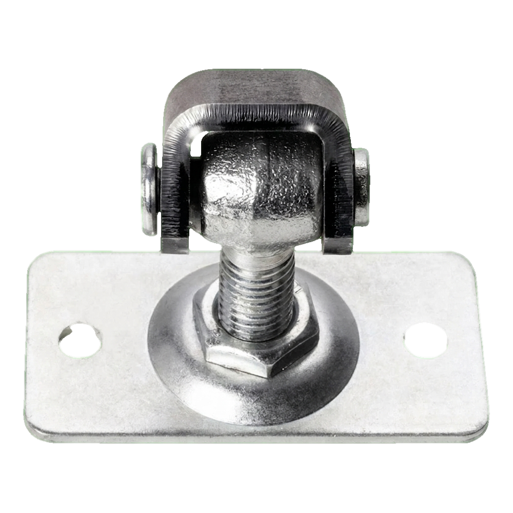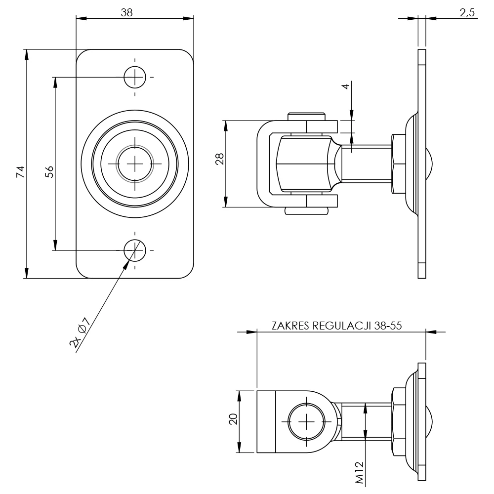 Obdélníkový štítek se čtyřmi montážními otvory zajišťuje stabilní a spolehlivé přišroubování ke sloupku nebo rámu. Závitový šroub M12 umožňuje plynulé nastavení vysunutí v rozsahu 38–55 mm, což dává instalatérovi plnou kontrolu nad nastavením branky vzhledem ke sloupku. Oko závěsu se volně otáčí na ose čepu a zajišťuje plynulý chod křídla.
