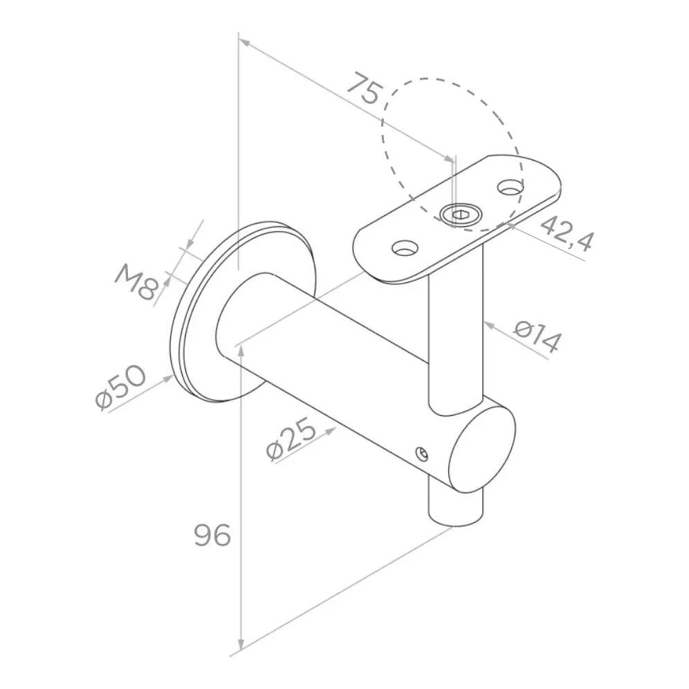 Držák se skládá z nástěnné rozety o průměru 50 mm, horizontálního ramena o průměru 25 mm a svislého sloupku s plochou montážní destičkou vybavenou otvory pro přišroubování zábradlí. Upevňovací závit M8 umožňuje spolehlivé osazení do stěny. Prvek se výborně hodí jako ukončení skleněných zábradlí i klasických trubkových systémů — zvyšuje vizuální hodnoty konstrukce a zajišťuje jednotnost celého systému zábradlí.