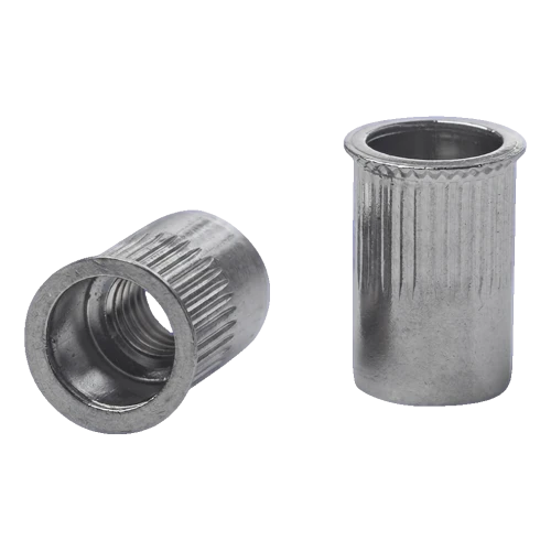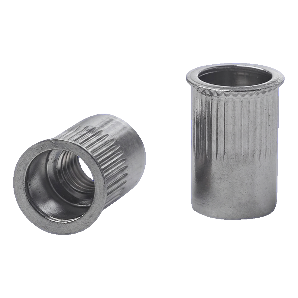 Nýtová matice průchozí M10 A2 – kuželový redukovaný límec, vroubkovaná, AISI 304