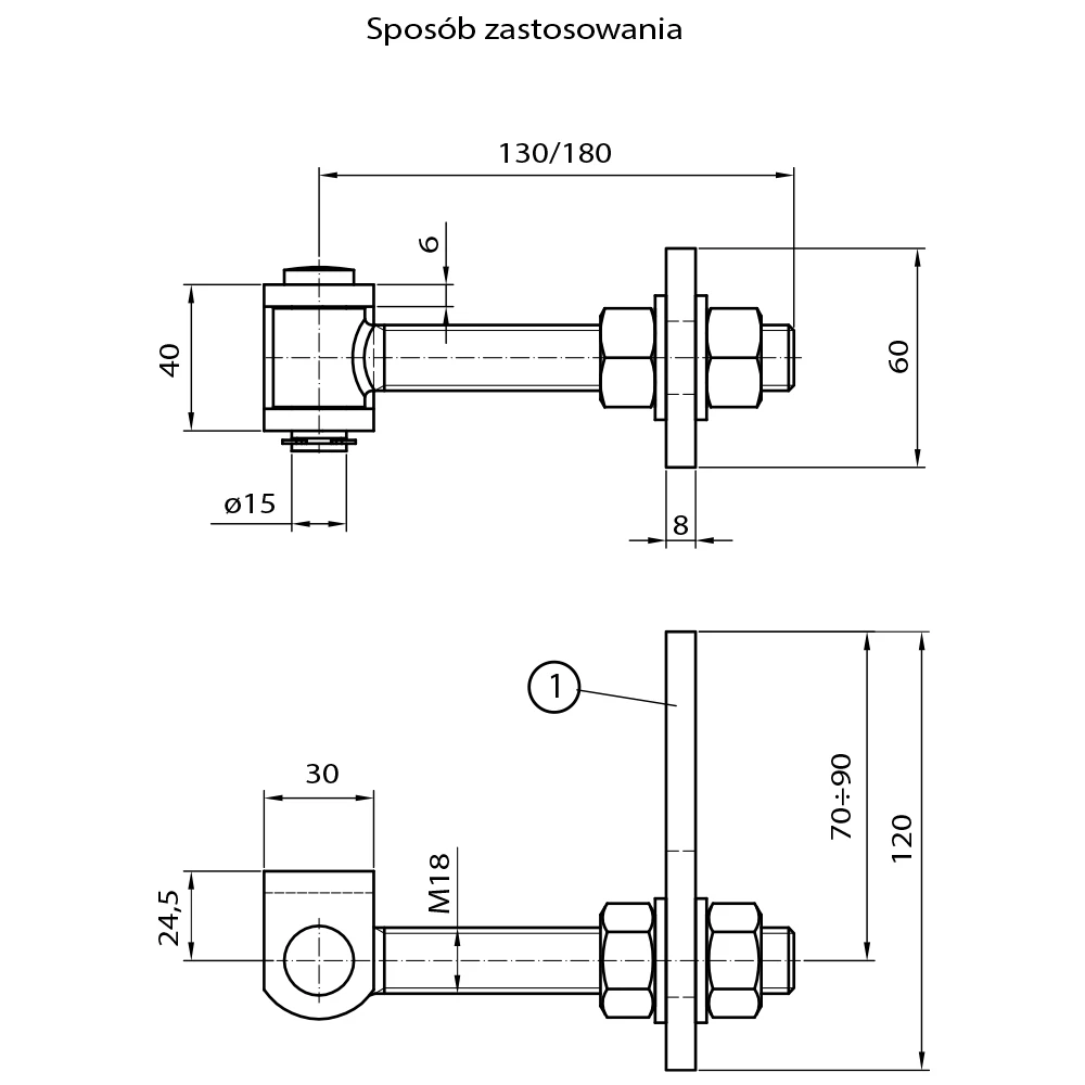 Spojovací prvek se montuje na křídlo brány nebo branky a čep závěsu M18 prochází podlouhlým otvorem a je uchycen maticemi na obou stranách. Schéma použití ukazuje dvě varianty délky čepu (130 mm nebo 180 mm), což umožňuje vybrat vhodný závěs podle tloušťky sloupku nebo rámu. Pouzdro závěsu (výška 40 mm, čep Ø15 mm) je přivařeno ke sloupku a spojovací prvek s podlouhlým otvorem umožňuje plynulé nastavení polohy křídla.