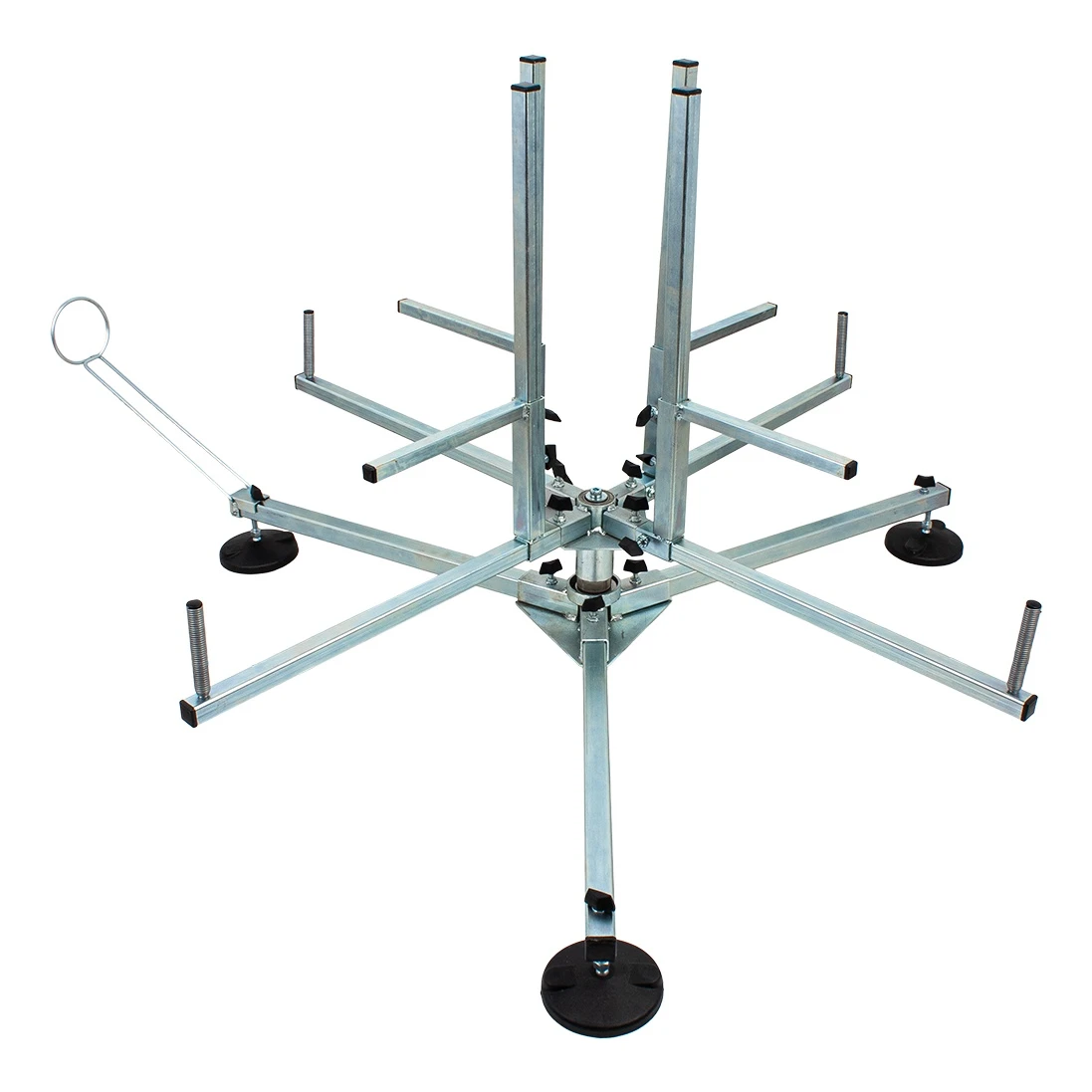 Konstrukce je vyrobena z vysoce kvalitních pozinkovaných ocelových profilů, což zaručuje dlouholetou trvanlivost i při intenzivním používání na stavbách. Stabilní hvězdicová základna s nastavitelnými patkami zajišťuje pevnou oporu na jakémkoli povrchu.