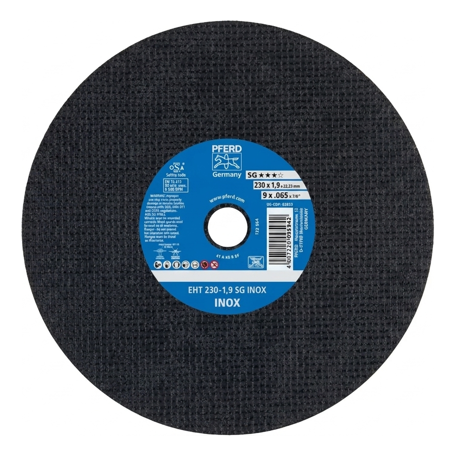 PFERD EHT 230-1,9 SG INOX je vysoce výkonný řezný kotouč z řady SG (Performance Line), navržený pro přesné řezání nerezové oceli (INOX) a uhlíkové oceli. Díky tloušťce pouhých 1,9 mm zajišťuje úzký, chladný řez — minimalizuje ohřev obráběného materiálu a omezuje vznik zabarvení, což je klíčové při práci s nerezovou ocelí.