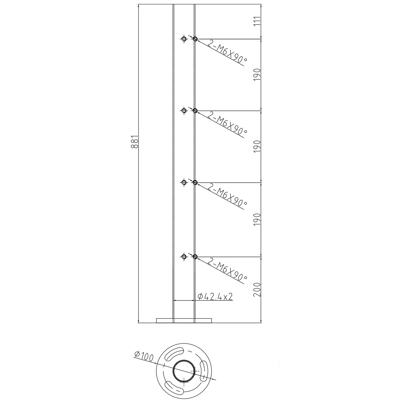 Sloupek má 8 otvorů se závitem M6 rozmístěných na 4 úrovních (po 2 otvorech na každé úrovni, v konfiguraci 2-M6×90°). Otvory se závitem umožňují přišroubování libovolných držáků na tyče, trubky nebo sklo — bez továrních omezení. Toto řešení oceňují instalatéři, kteří potřebují flexibilitu při přizpůsobování prvků individuálnímu projektu zábradlí.