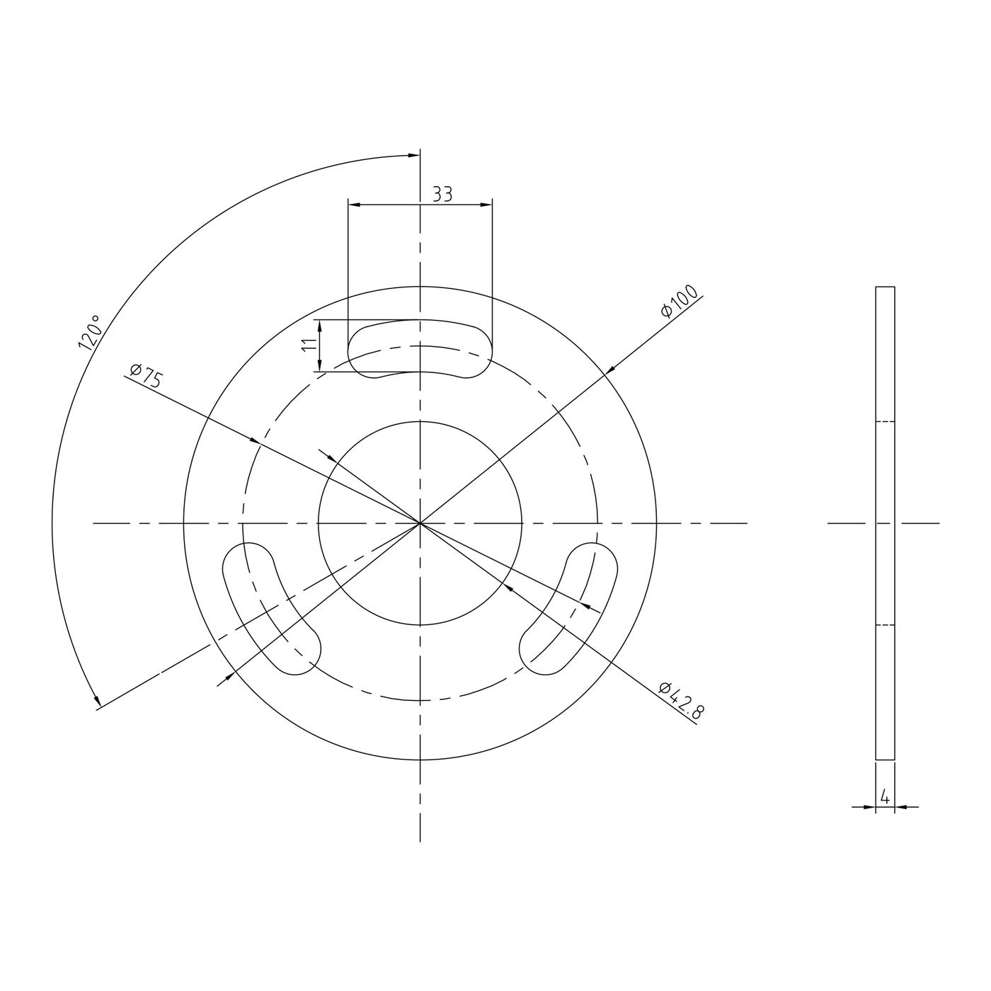 - Úhel rozteče mezi otvory: 120° (3 montážní otvory)