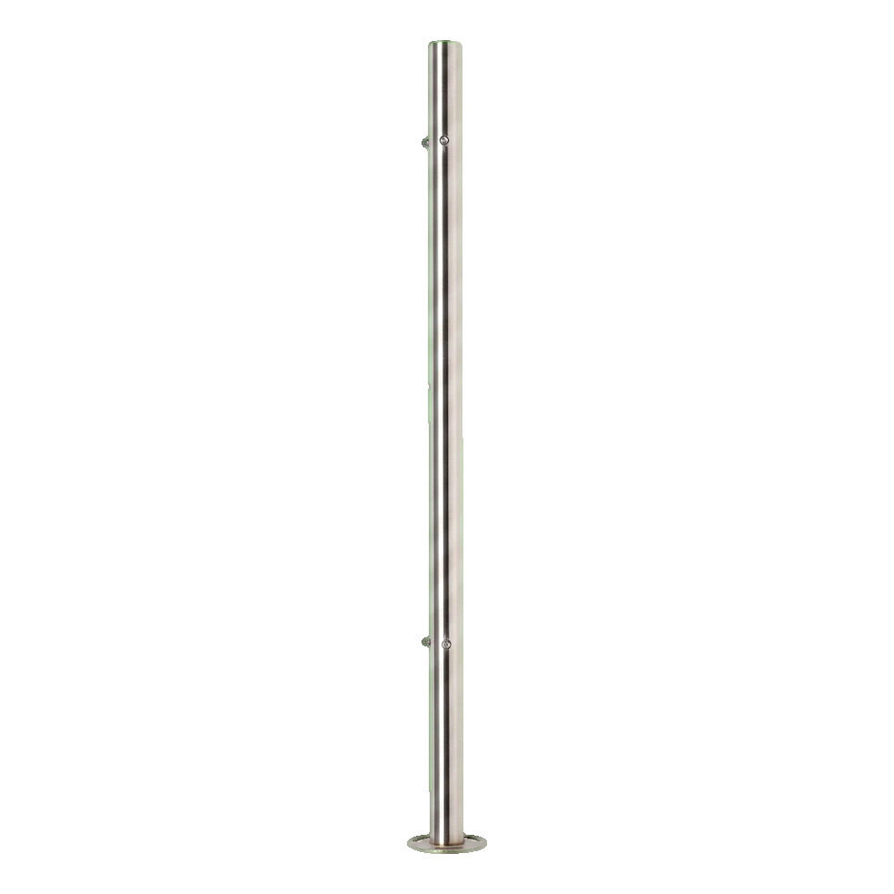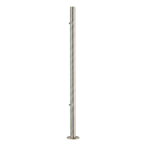 Sloupek je vybaven 4 precizně narezanými otvory M8 rozmístěnými ve dvou párech pod úhlem 90°, což umožňuje stabilní upevnění držáků pro tyče nebo trubky výplně zábradlí. Přivařená montážní základna o průměru ø100 mm se třemi fazolovými otvory zajišťuje spolehlivé a trvalé připevnění k podkladu. Sloupek je kompatibilní se standardním systémem zábradlí 42,4 mm.