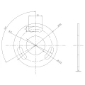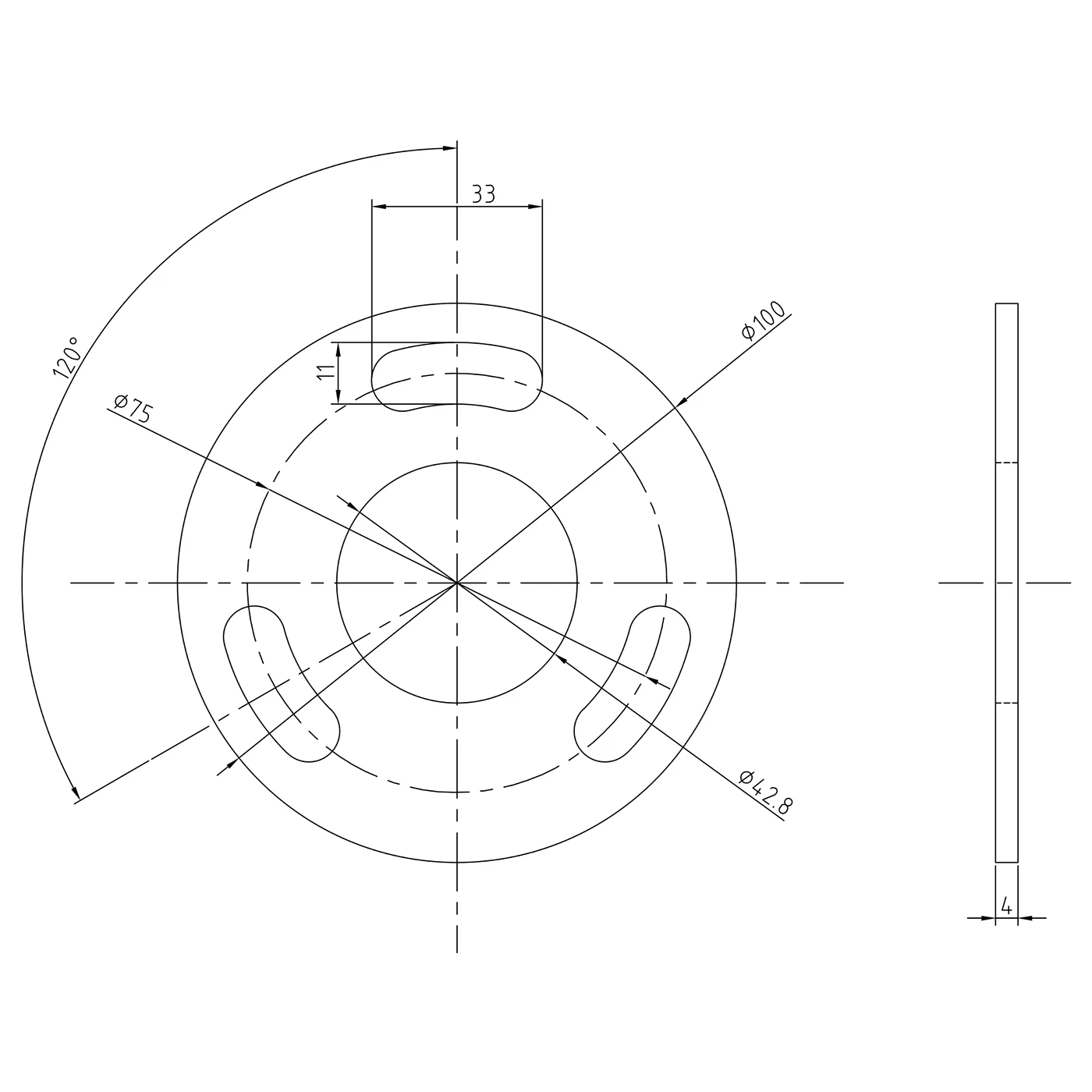 - Montážní otvory: 3 fazolové otvory (33 × 11 mm) na rozdělovacím průměru ø75 mm, rozmístěné po 120°