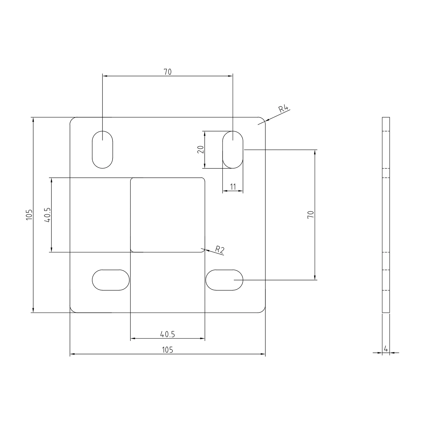 - Montážní otvory v základně: oválné (fazolky) 20×11 mm, rozteč 70×70 mm