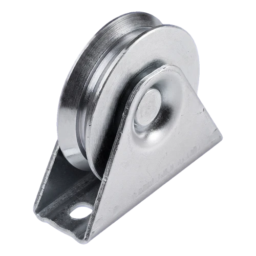 Ocelová jezdní kladka s drážkou V určená pro posuvné kolejnicové brány. Konstrukce z pozinkované oceli zajišťuje vysokou odolnost proti korozi a dlouholeté bezporuchové fungování v venkovních podmínkách. Kladka je osazena v masivním montážním držáku, což zaručuje stabilní vedení brány po jezdní kolejnici.