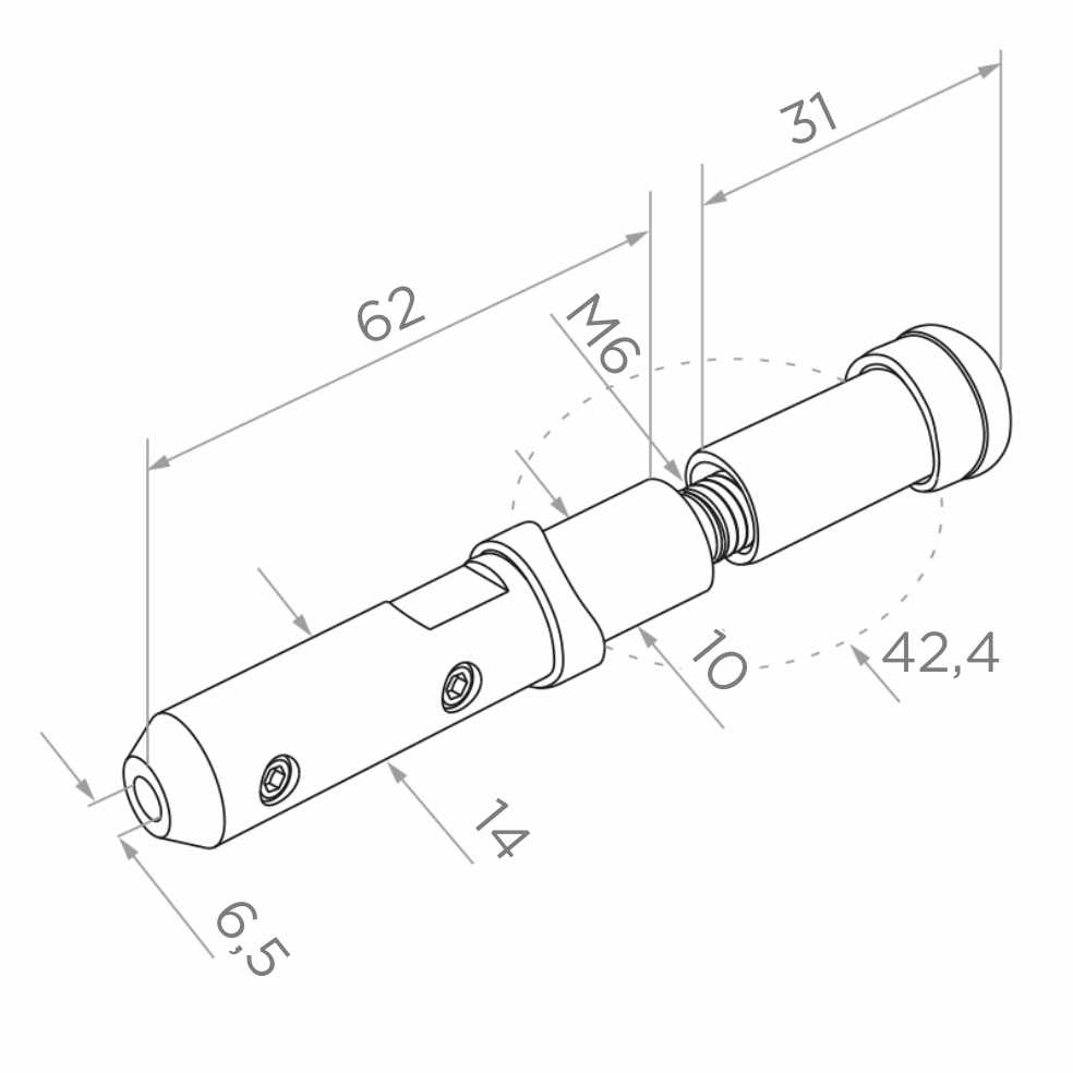 Koncová objímka (startovací) pro lanko fi 6 mm určená pro montáž v lankových systémech ocelových zábradlí. Element montovaný na krajní sloupek zábradlí (trubka Ø 42,4 mm) nebo přímo k ploše, např. stěně — univerzální použití v jednom produktu. Díky šroubovací konstrukci se závitem M6 objímka nevyžaduje svařování, což výrazně zkracuje čas montáže a eliminuje nutnost použití svářečky na stavbě.
