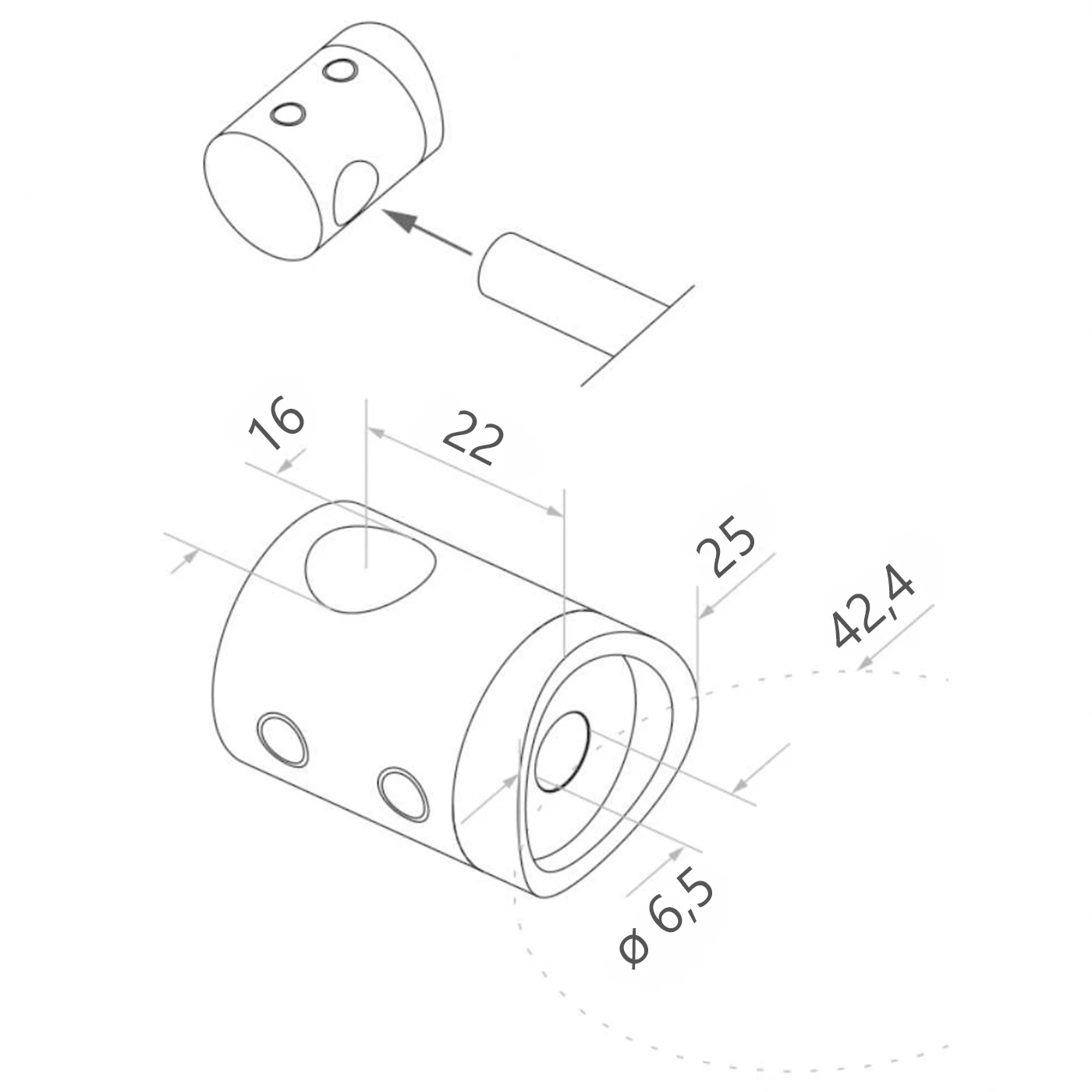 Svorka se montuje na nosnou trubku ø42,4 mm pomocí přítlačného šroubu — profilovaná základna zajišťuje úplné přilnutí k trubce bez vůlí. Boční otvory v těle slouží pro dotažení šroubů blokujících výplňovou tyč uvnitř svorky. Celé provedení z nerezové oceli AISI 304 zaručuje odolnost proti korozi a dlouholetou trvanlivost jak v interiérových, tak i exteriérových aplikacích.
