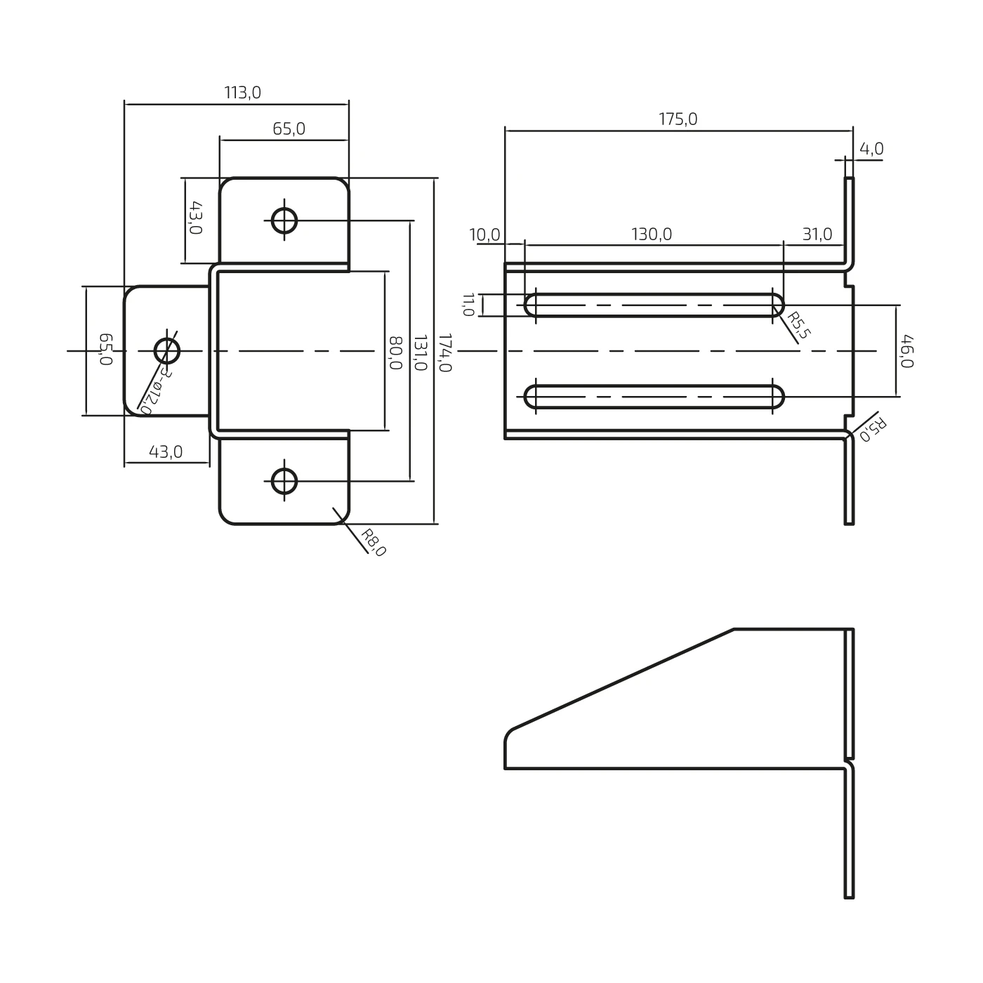 Konzola je vhodná pro montáž jak na ocelové, tak i betonové sloupky. Podlouhlé otvory umožňují precizní regulaci pozice adaptéru pojezdu ve vodorovné rovině, což je zvláště užitečné při korekci osy brány po osazení sloupků. Tři kulaté otvory ⌀12 mm na přírubách zajišťují spolehlivé kotvení prvku k podkladu.