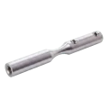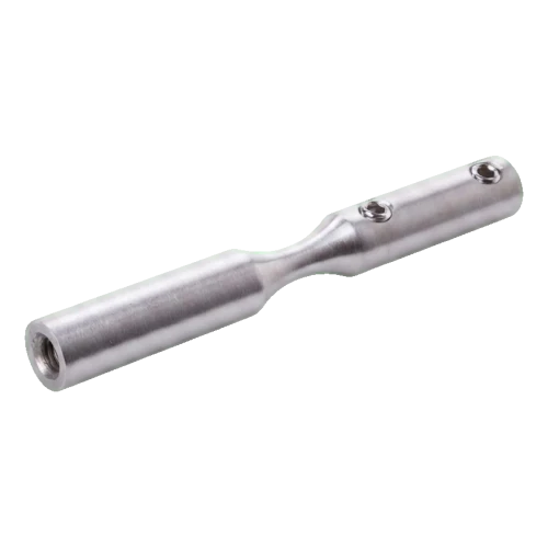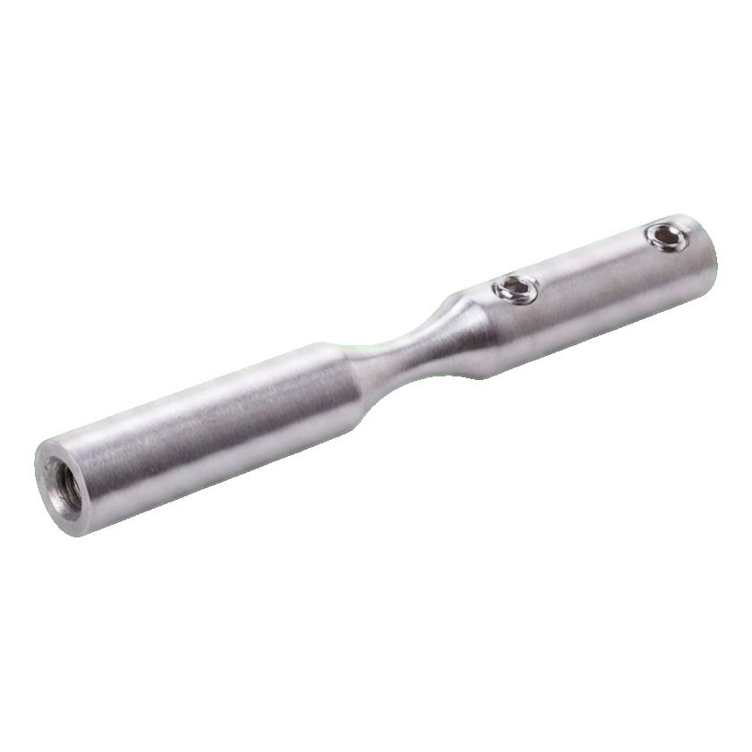 Prvek vyrobený z nerezové oceli AISI 304 s povrchovou úpravou satén zajišťuje vysokou odolnost proti korozi a estetický, tlumený vzhled. Montáž se provádí přišroubováním — držák je vybaven závity M6 a blokujícími otvory (Ø6 mm), což zaručuje stabilní a trvalé spojení s lankem a nosnou konstrukcí.