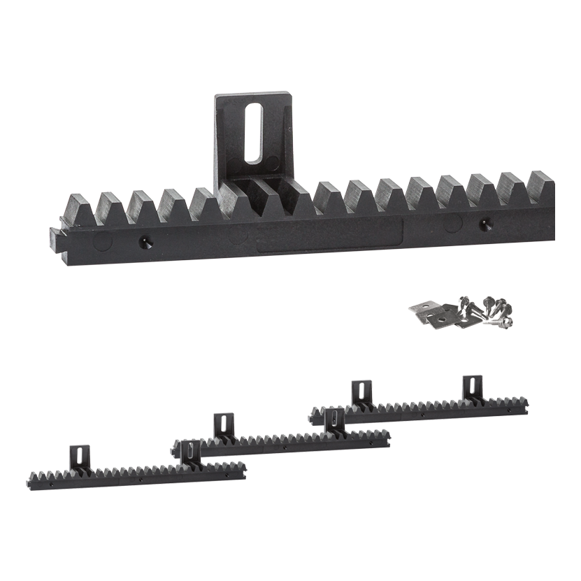 V sadě se nacházejí tři úseky lišty o délce 333 mm každý, spojované mezi sebou pomocí zámků — díky tomu získáte souvislou linii ozubení bez nutnosti přesného dořezávání. Každý úsek je vybaven dvěma montážními držáky, které umožňují rychlé a pohodlné přišroubování lišty k křídlu brány. K sadě jsou přiloženy také samořezné šrouby s podložkami, což eliminuje potřebu kompletování samostatných spojovacích prvků — vše potřebné k montáži je v jednom balení.